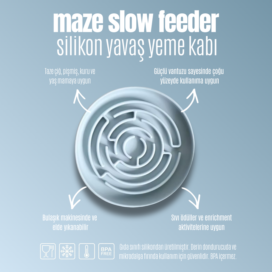 The Maze Slow Feeder silicone slow feeder is designed to extend feeding times and encourage more controlled eating in dogs. Its maze-like structure takes time for the dog to reach the food, naturally slowing down the feeding process. It can be used with dry, wet, cooked, and liquid foods; adding mental stimulation to the feeding routine. The strong suction cup base adheres to most flat surfaces, helping to reduce slipping during use.